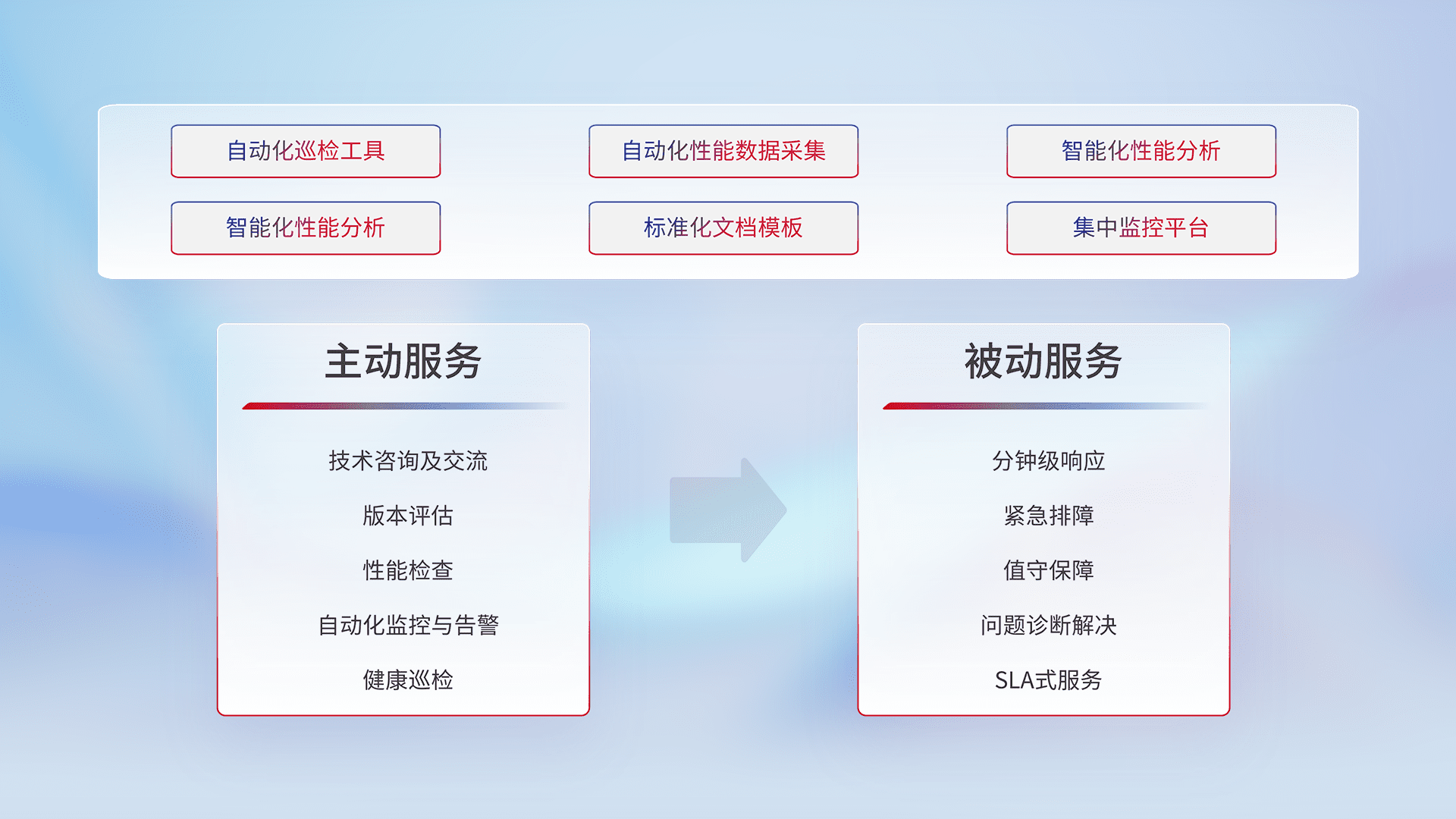 智能化工具和标准化文档,,,保障服务质量,,,,提供主动服务(包含技术咨询、、、版本评估、、、、性能检查、、自动化监控与告警、、健康巡检)和被动服务包含(分钟级响应、、、、紧急排障、、值守保障、、、、问题诊断解决、、SLA服务)。。。。