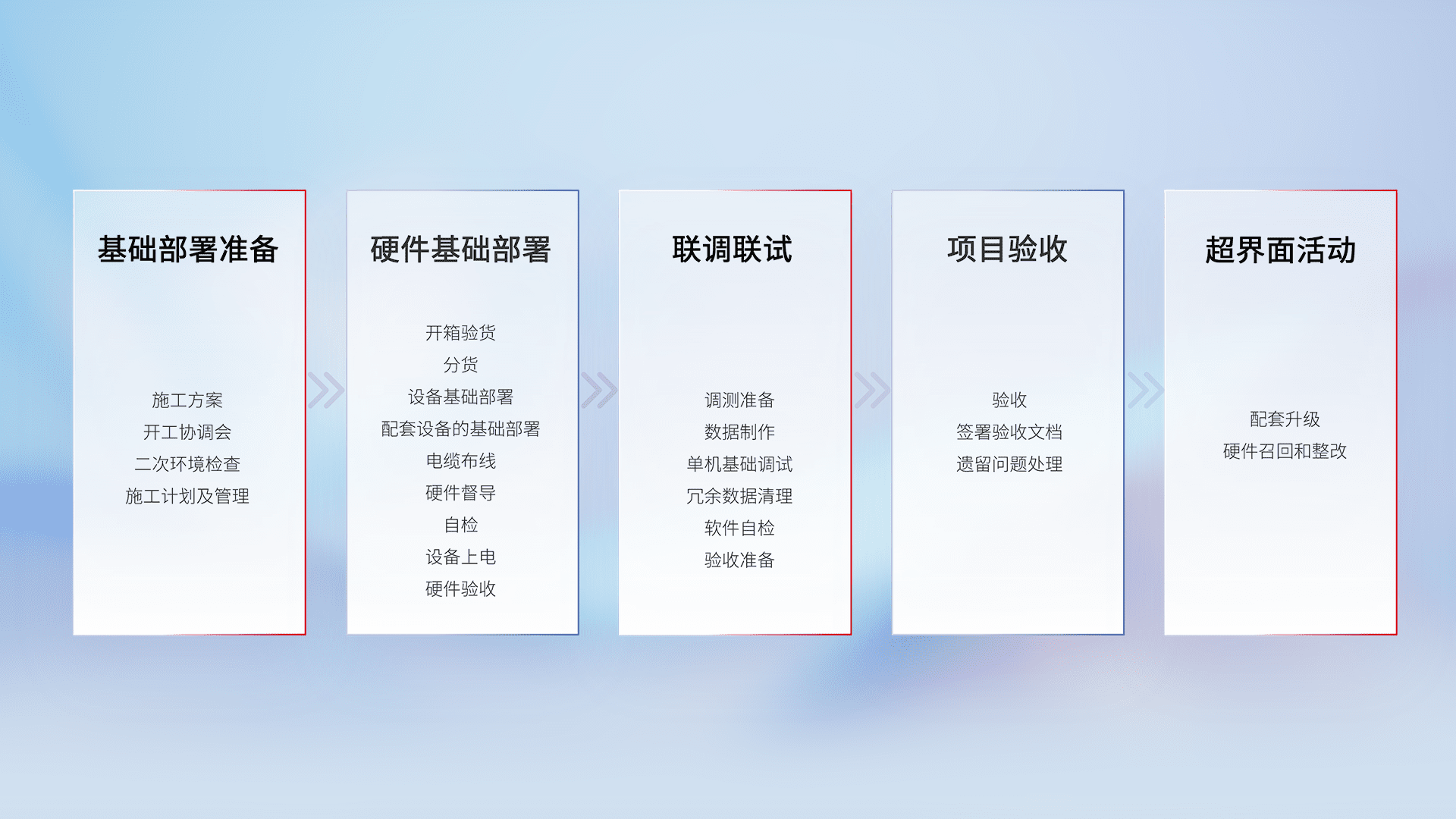 从基础部署准备、、、硬件基础部署、、、联调联试、、、、项目验收、、、越界面活动的全过程可追溯,,保证施工质量和进度。。。。